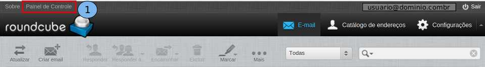 Após acessar o Webmail http://webmail.dominio.com.br, siga os procedimento abaixo: Para acessar o Painel do usuário final, pelo o Webmail, clique no Link “Painel de Controle” (1) que se encontra no cabeçalho da página, logo o acesso será redirecionado para o link http://painel.dominiodehospedagem.com.br/.