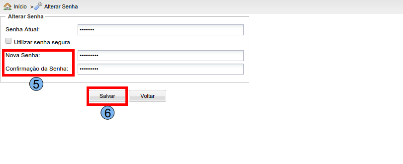 Nesta tela, para alterar a senha será preciso inserir a senha atual, basta digitá-la no campo “Senha Atual” (2).