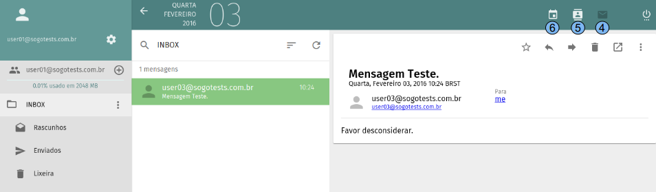 A tela inicial é similar as funções já presente no Webmail anterior, contudo agora são exibidas as opções de Correio (4), Catálogo (5) e Calendário (6).