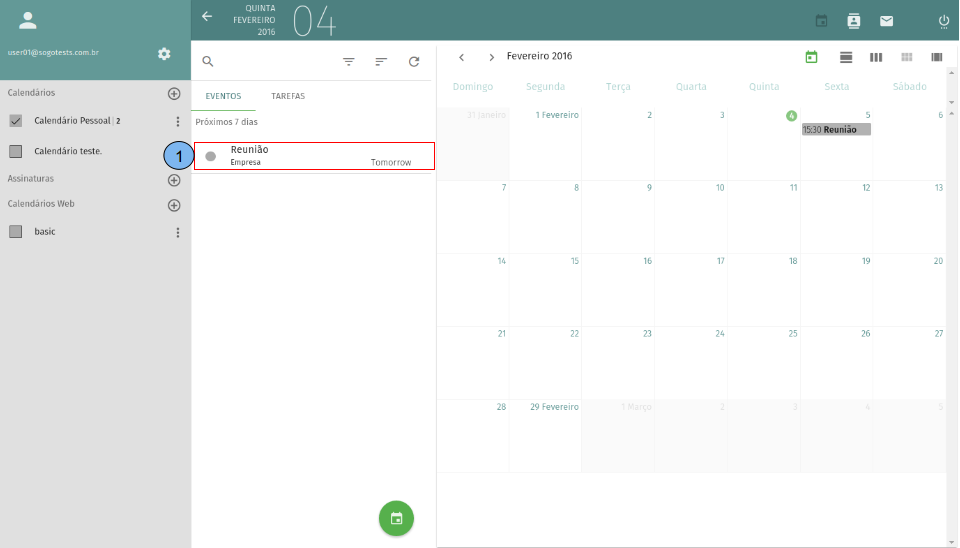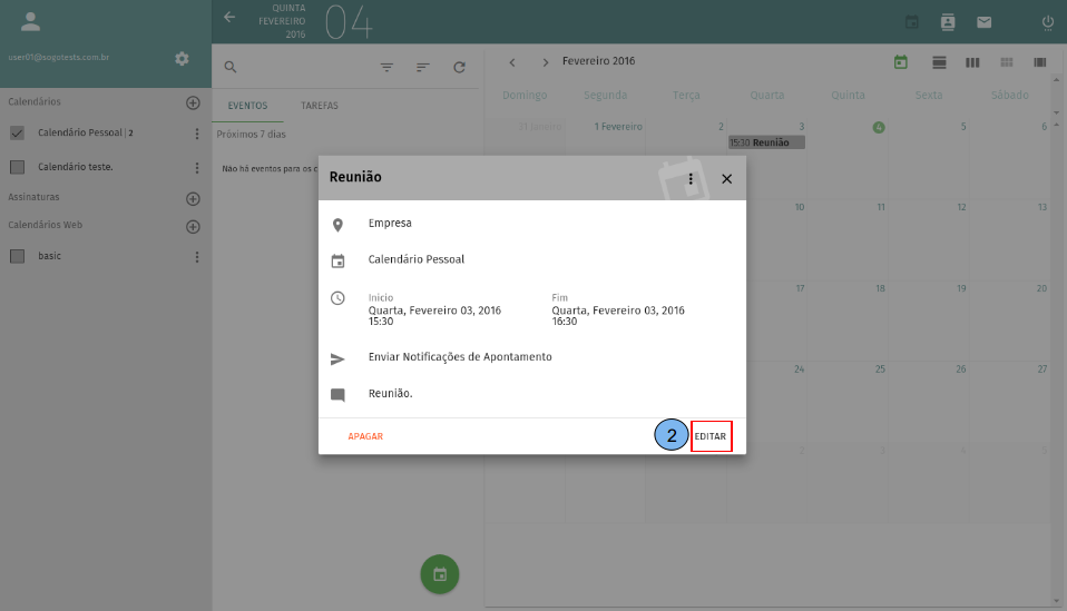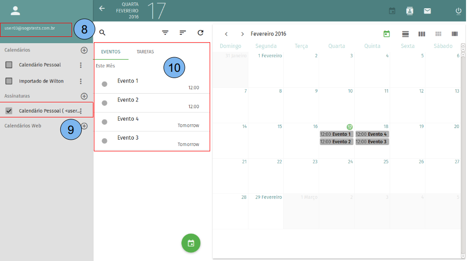 Na conta para onde o calendário foi compartilhado (8), veja que o calendário já aparece para o usuário (9), ao selecionar o calendário em questão é possível acessar os eventos e tarefas do mesmo (10).