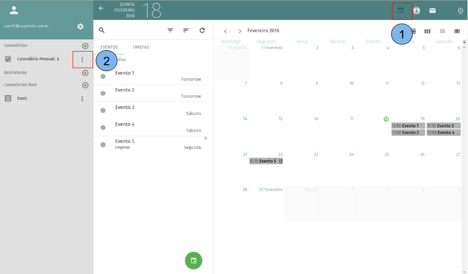 São as permissões especificas de acesso ao seu calendário que cada usuário do domínio terá. (1)Acesse Calendário. (2)Em seguida acesse o menu do calendário.