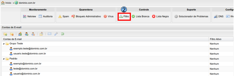 Para iniciar o processo de Configuração de Filtro de Segurança em domínio, na tela inicial do Painel de Controle, localize o domínio que será configurado, neste caso, será utilizado “domínio.com.br” (1), clique duas vezes sobre o mesmo.