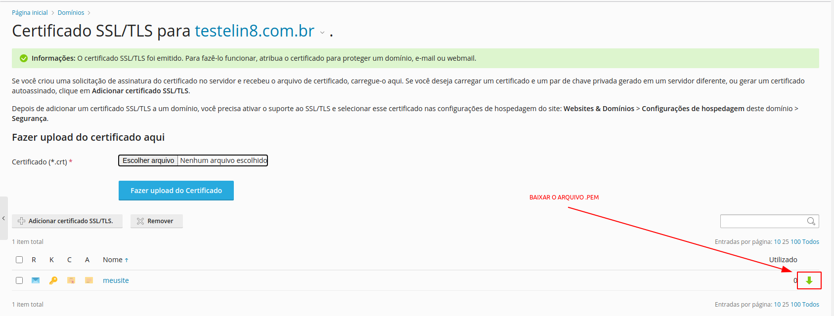 - E faça o upload dos arquivos .crt e CA e depois clique no botão Fazer upload do Certificado.