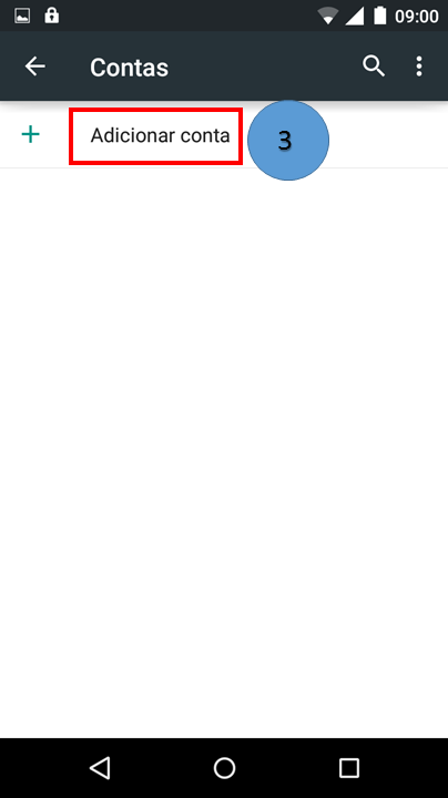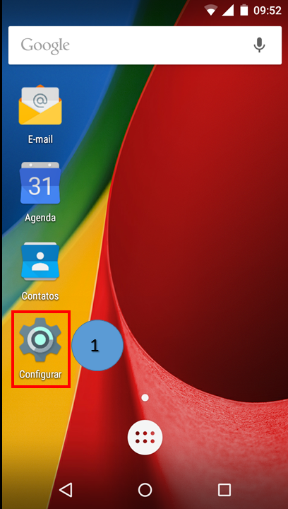 As telas abaixo mostram como realizar a configuração da conta em dispositivos Android. Abra Configurar “desenho de uma engrenagem”(1)