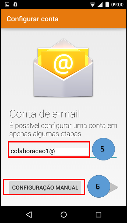 Na próxima tela insira seu e-mail (5) em seguida clique em “Configuração Manual”(6).