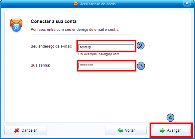 Em “Seu endereço de e-mail” (2), digite seu e-mail e em “Sua senha” (3), digite a senha de seu e-mail, depois clique em “Avançar” (4).