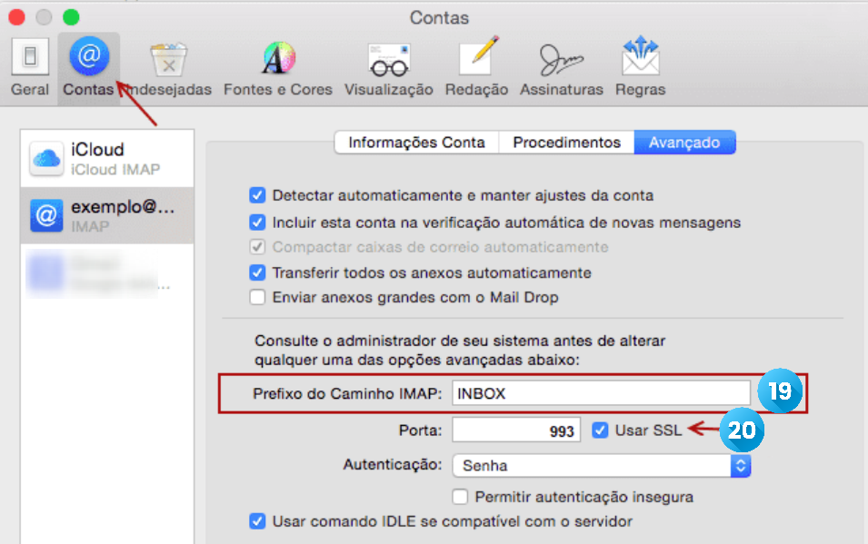 Em Prefixo do caminho IMAP insira INBOX   19   e marque a caixa Usar SSL.   20