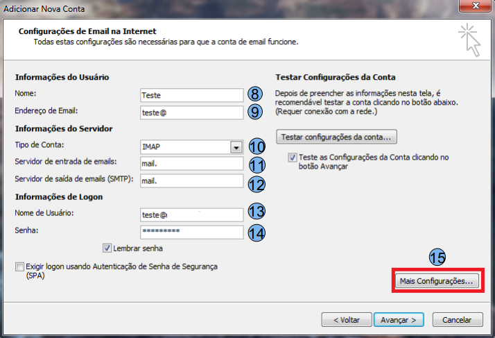 Preencha os campos: Nome (8): Digite o nome para exibição Endereço de Email (9): Digite seu email no domínio Tipo de Conta (10): Defina o tipo de conta como IMAP Servidor de entrada de emails (11): Digite o endereço do servidor conforme o domínio Servidor de saída de emails (SMTP) (12): Digite o endereço do servidor conforme o domínio Nome de Usuário (13): Digite novamente seu email no domínio Senha (14): Digite sua senha Após preencher os campos acima, clique em Mais configurações (15).