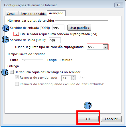 Na aba Avançado altere a porta na opção Servidor de entrada POP3 (14) para 995, na opção Servidor de saída (SMTP) (15), altere para 465, não marque a opção Deixar uma cópia de mensagens no servidor, pois na configuração POP, esta opção poderá baixar os e-mails novamente, depois clique em Ok (17).
