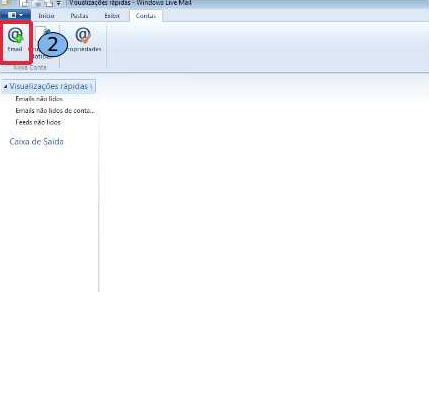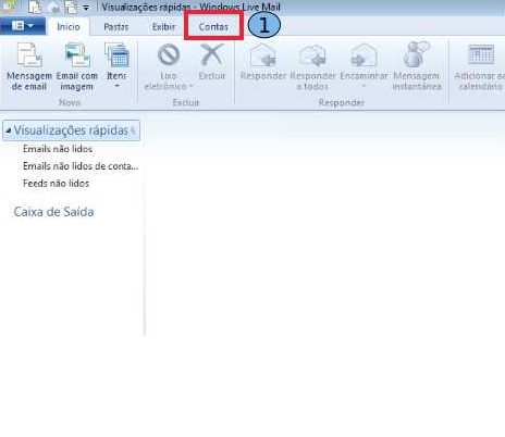 Ao abrir o Windows Live Mail, no Menu Superior, clique na opção "Contas"(1).