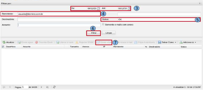 Guia “Remetente” (4) - adicione a conta de e-mail que deseja recuperar os e-mails. Guia “Status” (5) - neste campo, você pode adicionar qual status “OK” e clique em “Filtrar”(6).