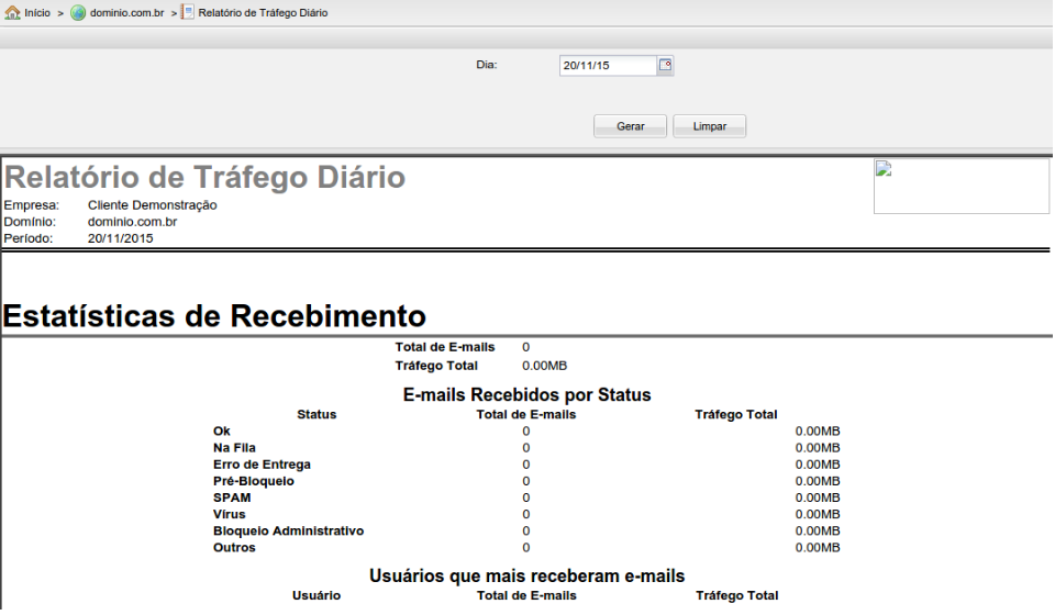 Nesta tela será exibido o relatório diário de e-mails recebidos pelo domínio, será possível visualizar os E-mails Recebidos por Status e também os Usuários que mais receberam e-mails.