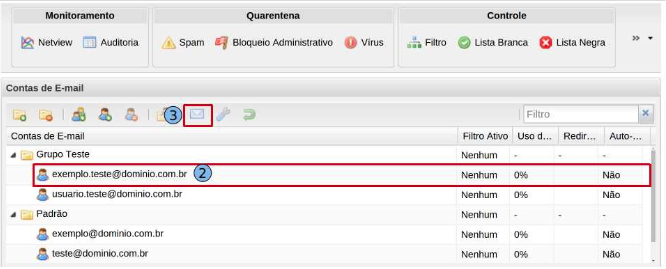 Selecione a conta que deseja remover o Redirecionamento (2). Na guia “Contas de E-mail” clique no ícone “Redirecionamento” (3).